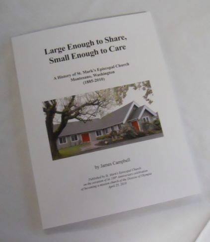St. Mark's has published a 90 page full color history of their ministry in Montesano, at their 100th anniversary of becoming a mission church of the Diocese of Olympia. The books are 8 1/2" x 11" full size paperback style, and are only $15 each. To purchase a copy, please contact Jim Campbell at jbcmonte@comcast.net or by phone at 360-612-0205.